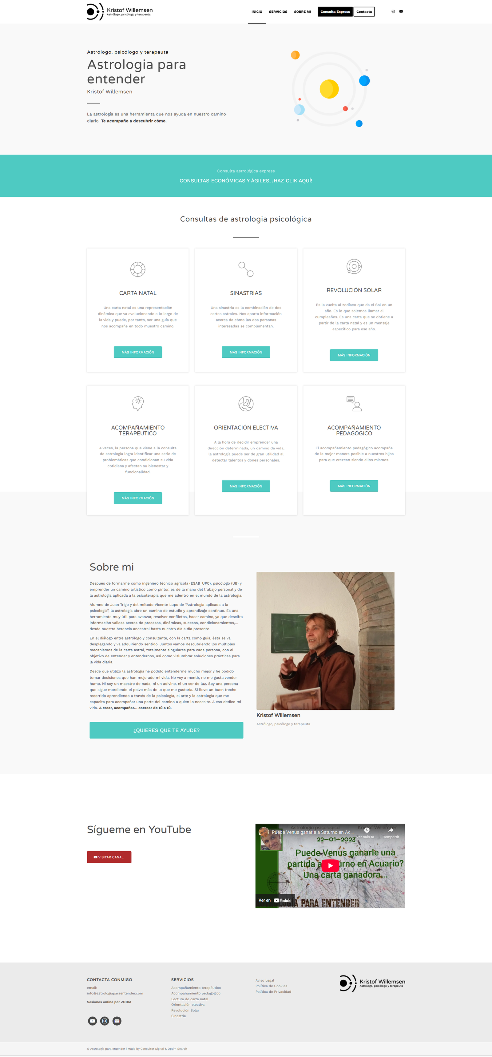 El diseño se centró en una identidad visual limpia y profesional, con una navegación intuitiva y un estilo que reflejara su enfoque integrador de la astrología, la psicología y la terapia.